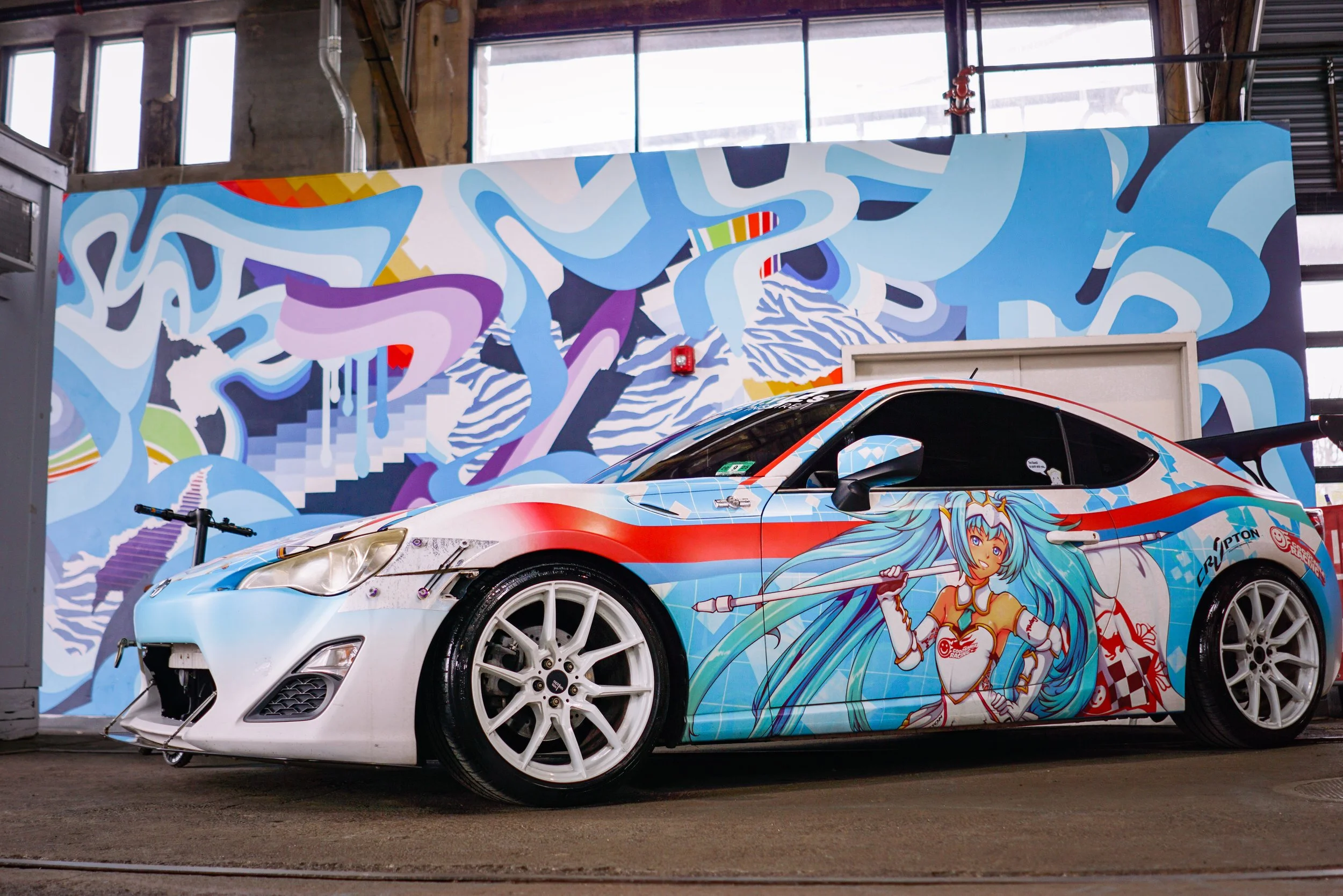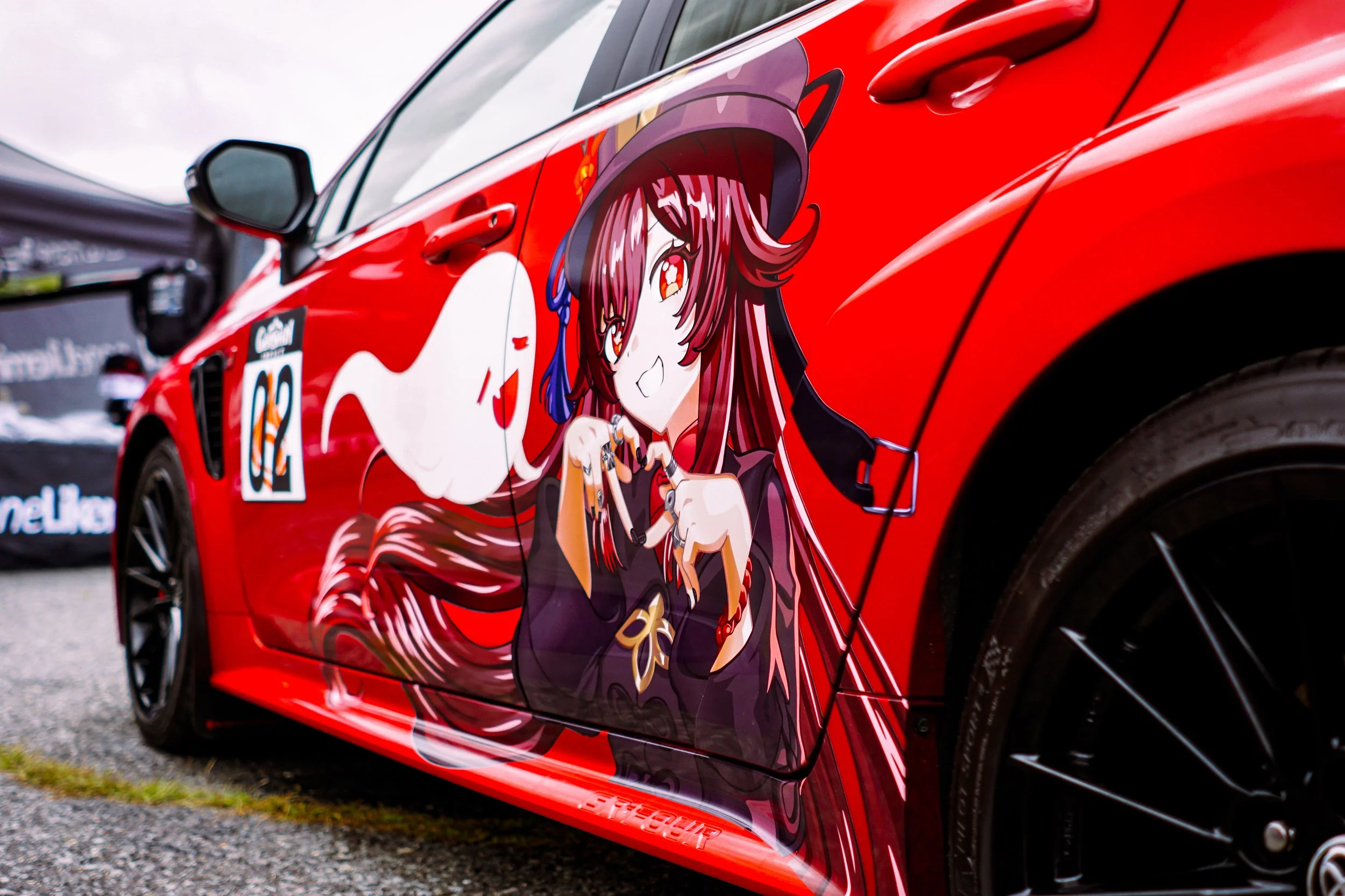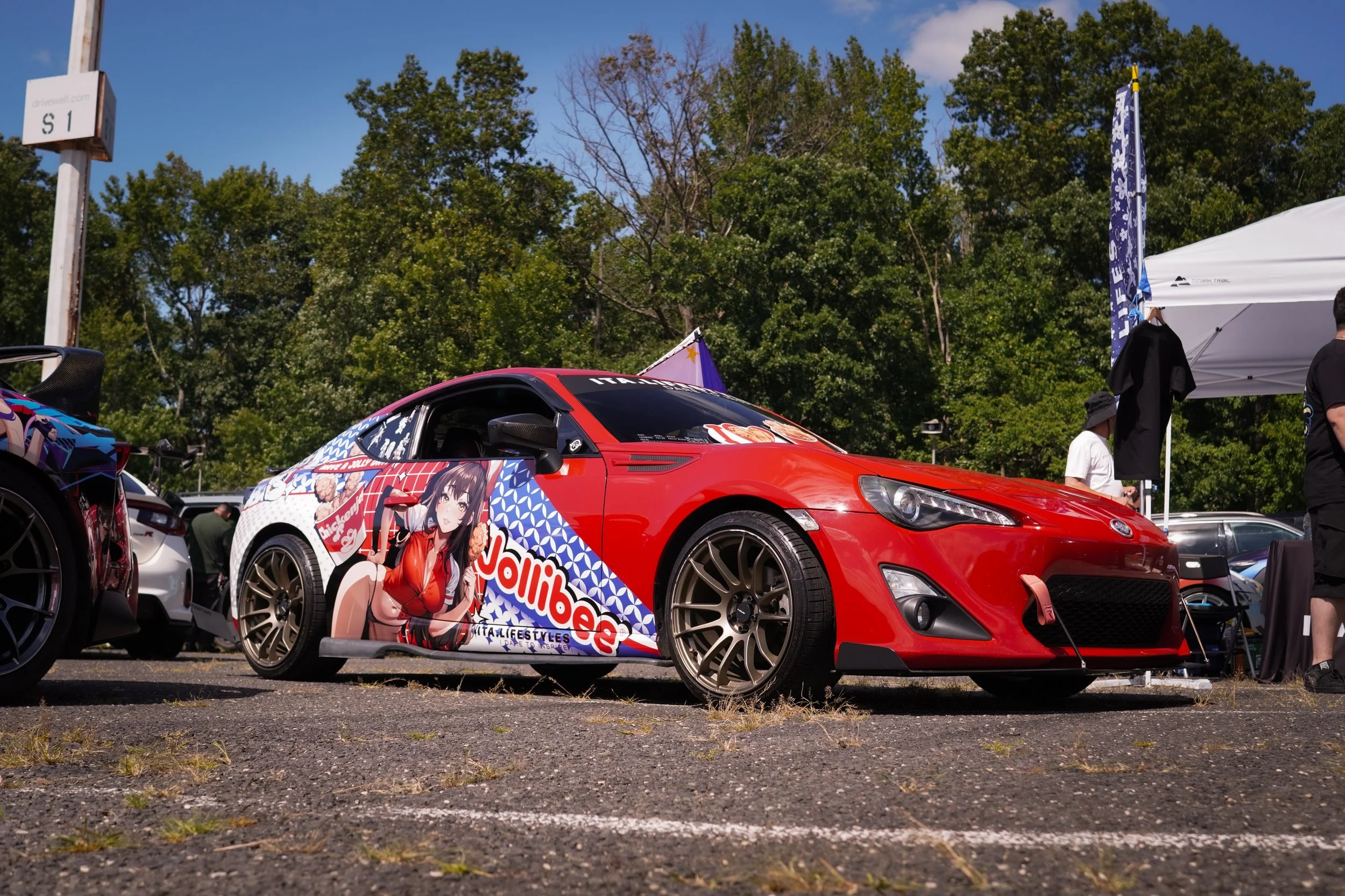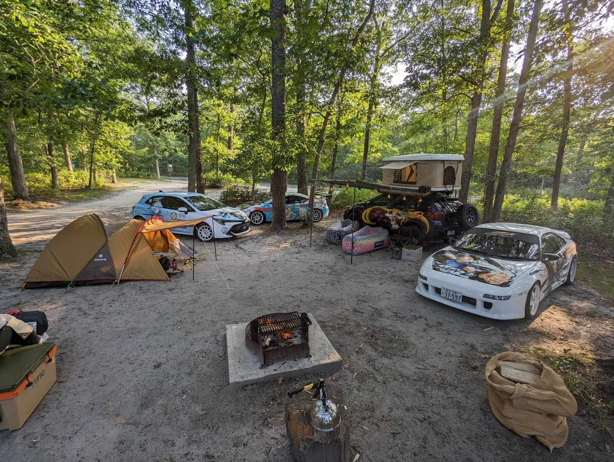 a group of friends, gathered together on a camping trip with their itasha cars.