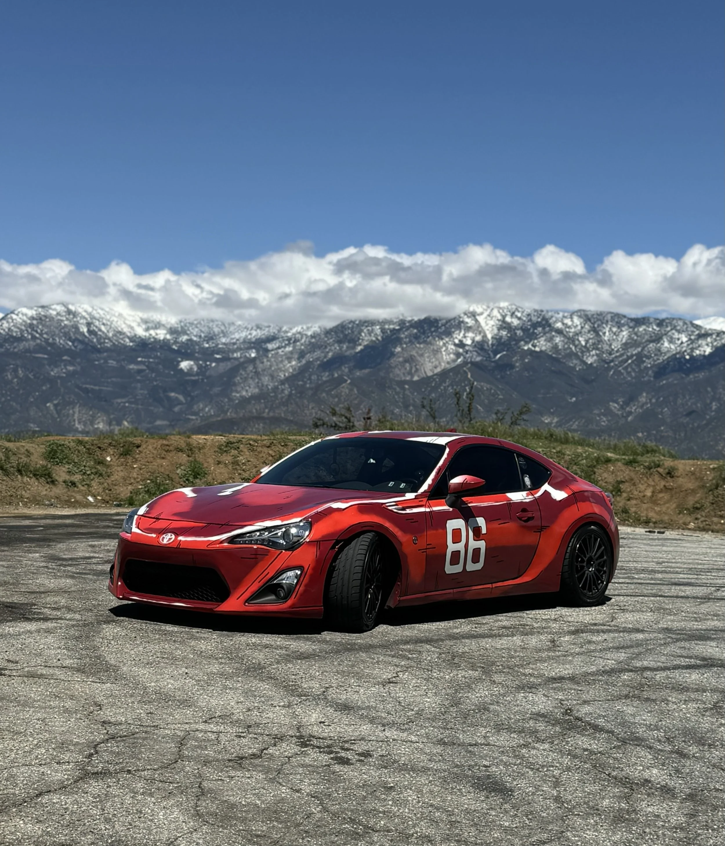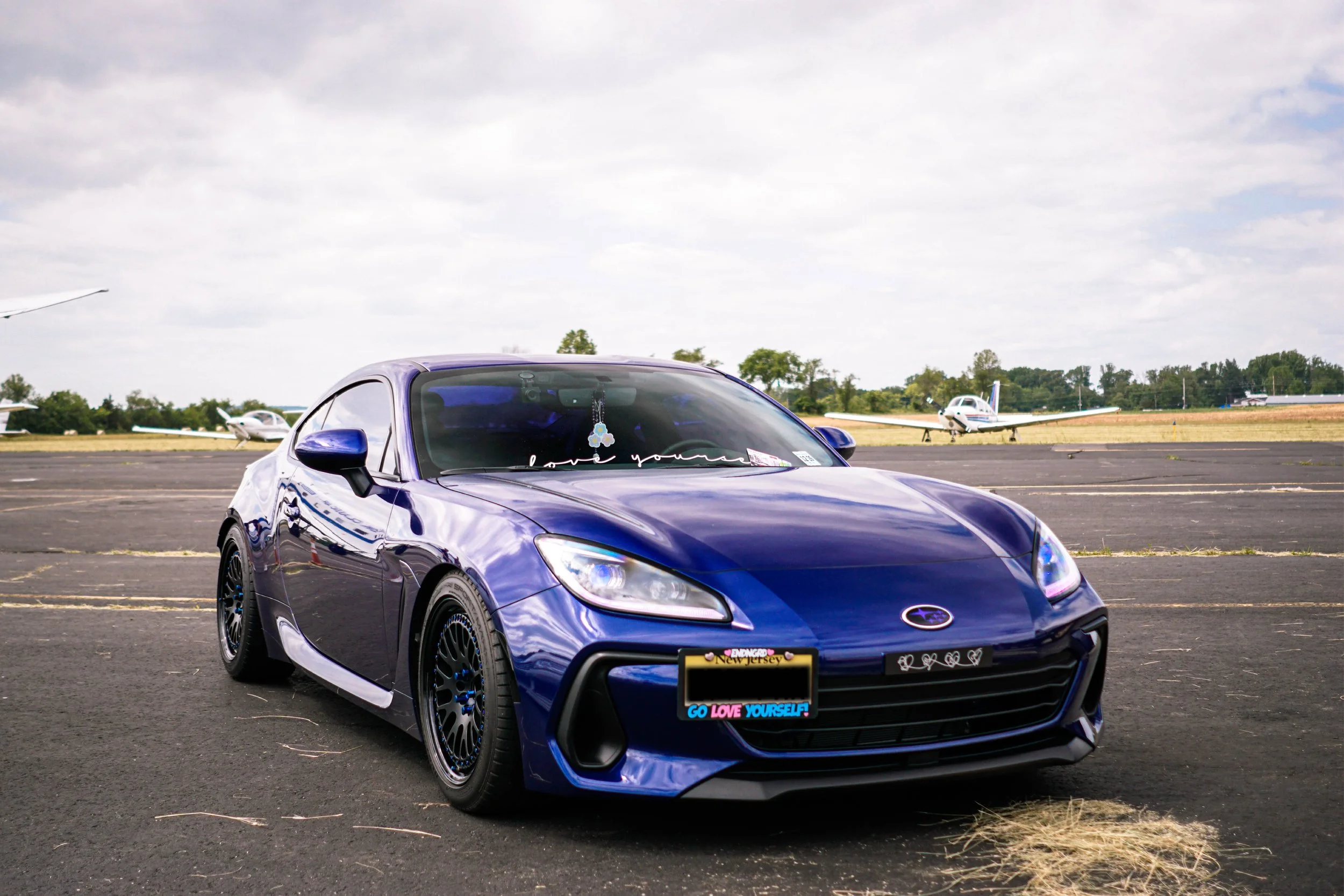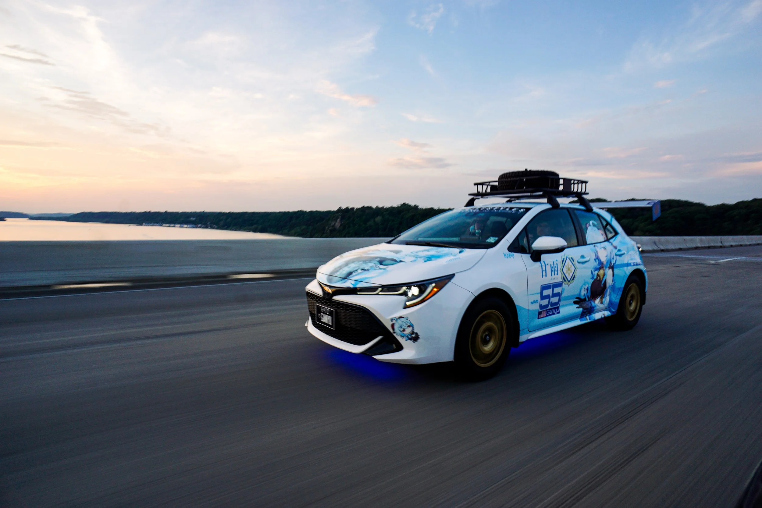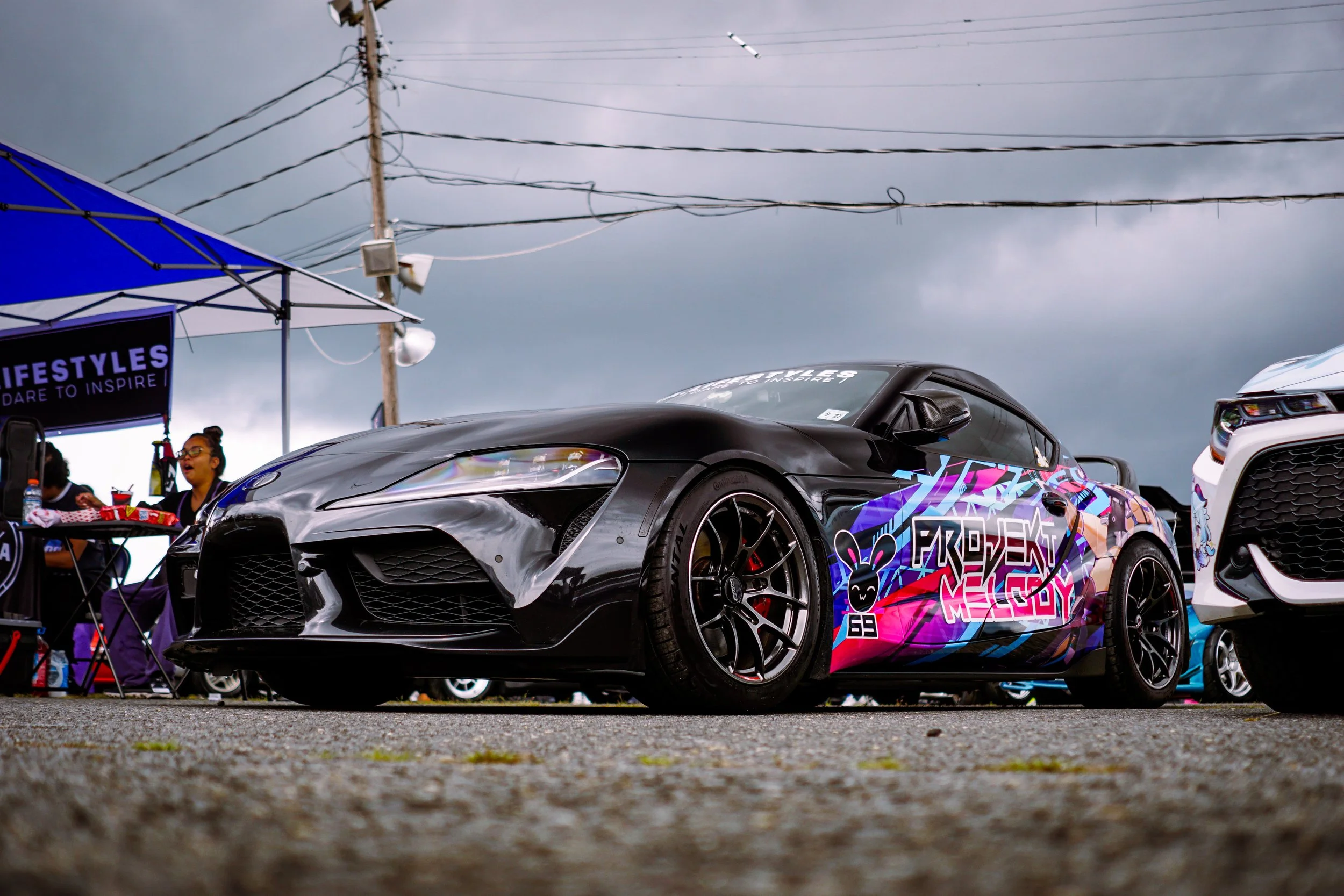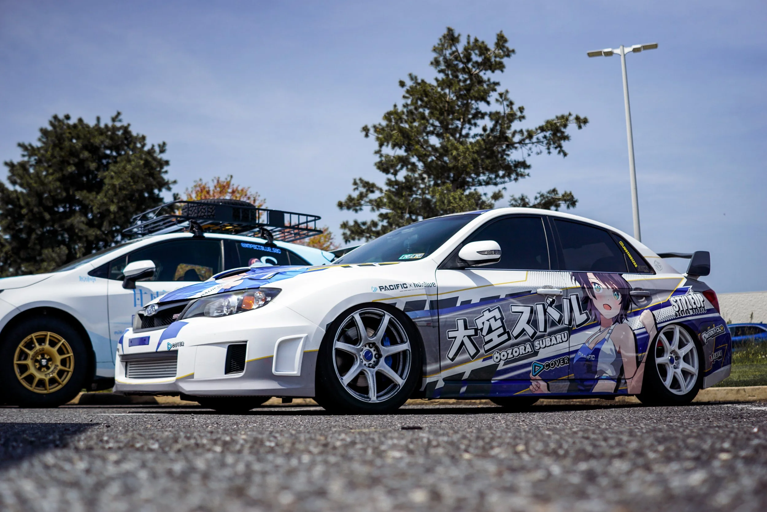 a group of friends, gathered together on a camping trip with their itasha cars.
